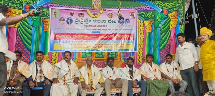 ಬಳ್ಳಾರಿ, ಫೆ.04 ನಗರದ ಬಂಡಿಹಟ್ಟಿ ಗ್ರಾಮದಲ್ಲಿ ಶ್ರೀ ರಮಲಾ ದೇವಿ ಟ್ರಸ್ಟ್ ವತಿಯಿಂದ ಪ್ರಮೀಳಾ ಧರ್ಬಾರ್ ಹಾಗೂ ಅರ್ಜುನನ ಗರ್ವಭಂಗ ಬೈಲಾಟ (ನಾಟಕ) ಏರ್ಪಡಿಸಲಾಗಿತ್ತು