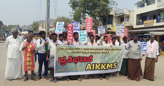 ಬಳ್ಳಾರಿ, ಮಾ.16: ಎ ಐ ಕೆ ಕೆ ಎಂ ಎಸ್ ರೈತ ಸಂಘಟನೆ ವತಿಯಿಂದ ಇಂದು ರೈತರ ಪಂಪ್ ಸೆಟ್ ಗಳಿಗೆ 7 ಗಂಟೆ ನಿರಂತರವಾಗಿ ವಿದ್ಯುತ್ ಪೂರೈಕೆಗಾಗಿ ಆಗ್ರಹಿಸಿ ಪಟ್ಟಣದ ಕೆ.ಇ ಬಿ ಕಚೇರಿ ಮುಂದೆ ಪ್ರತಿಭಟನೆ ಮಾಡಲಾಯಿತು