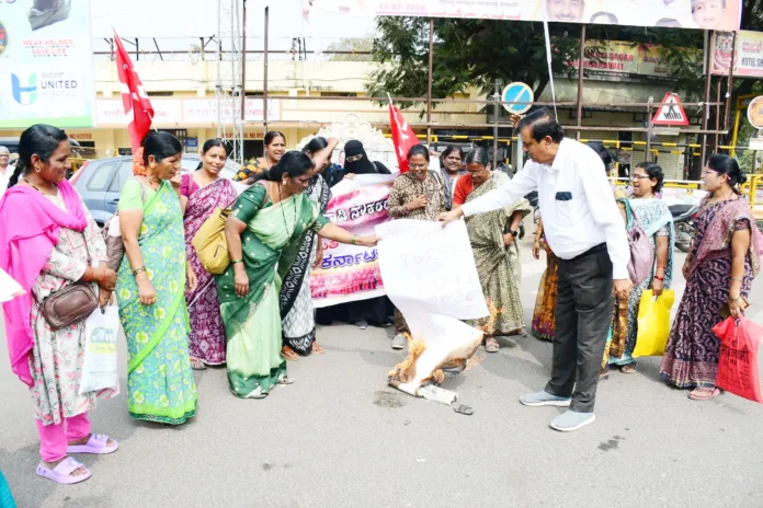 ಕಲಬುರಗಿ: ಅಖಿಲ ಭಾರತ ಅಂಗನವಾಡಿ ಕಾರ್ಯಕರ್ತೆಯರ ಮತ್ತು ಸಹಾಯಕಿಯರ ಒಕ್ಕೂಟ (ಎಐಎಫ್ಎಡಬ್ಲ್ಯುಎಚ್) ಸಂಘಟನೆಯ ನೆತೃತ್ವದಲ್ಲಿ ಇಂದು ಕೇಂದ್ರದ 2026-27ನೇ ಸಾಲಿನ ಬಜೆಟ್ ನಲ್ಲಿ ಅಂಗನವಾಡಿ ಮತ್ತು ಇತರ ಸ್ಕೀಮ ವರ್ಕರಗಳು ಮತ್ತು ಮೂಲಭೂತ ಸೇವೆಗಳ ದುಸ್ಥಿತಿ ಹಾಗೂ ಹಕ್ಕುಗಳ ಬಗ್ಗೆ ಮಾರಣಾಂತಿಕ ಮೌನ ವಹಿಸಿರುವುದನ್ನು ಬಲವಾಗಿ ಖಂಡಿಸಿ ಜನವಿರೋಧಿ ಕೇಂದ್ರದ ಬಜೆಟ್ ಪ್ರತಿಯ ನಕಲಿಗೆ ಬೆಂಕಿಹಚ್ಚಿ ತಮ್ಮ ಆಕ್ರೋಶವನ್ನು ವ್ಯಕ್ತಪಿಸಲಾಯಿತು. ಎಂ.ಬಿ ಸಜ್ಜನ, ಗೌರಮ್ಮ ಪಾಟೀಲ, ರತ್ನ, ಶೇಖಮ್ಮ, ನೇತ್ರಾವತಿ, ಶಾಂತಾ, ಅನುಸೂಯಾ, ರೇಣುಕಾ, ನಿರ್ಮಲಾ, ಶಿವಲಿಲಾ, ಇರ್ಫಾನಾ ಶೇಖ, ಶಾಹೀನ ಬೇಗಂ ಸೇರಿದಂತೆ ಹಲವರಿದ್ದರು.