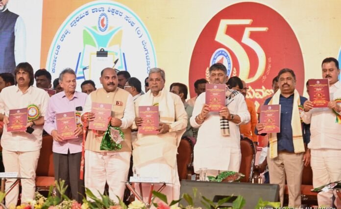 ರಾಜ್ಯ ಪ್ರಾಥಮಿಕ ಶಾಲಾ ಶಿಕ್ಷಕರ ಸಂಘದಿಂದ ನಗರದ ತ್ರಿಪುರ ವಾಸಿನಿ ಅರಮನೆ ಮೈದಾನದಲ್ಲಿ ಏರ್ಪಡಿಸಿದ್ದ ರಾಜ್ಯಮಟ್ಟದ ಶೈಕ್ಷಣಿಕ ಮಹಾ ಸಮ್ಮೇಳನ ಹಾಗೂ ಸುವರ್ಣೋತ್ಸವ ಕಾರ್ಯಕ್ರಮಕ್ಕೆ ಮುಖ್ಯಮಂತ್ರಿ ಸಿದ್ದರಾಮಯ್ಯ ಚಾಲನೆ ನೀಡಿದರು. ಡಿಸಿಎಂ ಡಿ.ಕೆ. ಶಿವಕುಮಾರ್, ಸಚಿವ ಮಧುಬಂಗಾರಪ್ಪ, ಸಾಹಿತಿ ಬರಗೂರು ರಾಮಚಂದ್ರಪ್ಪ ಇತರರು ಇದ್ದರು.