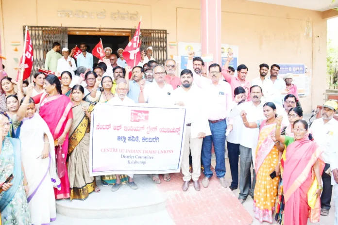 ಕಲಬುರಗಿ: ರಾಜ್ಯದ ಅನುಸೂಚಿತ ಉದ್ದಿಮೆಗಳಿಗೆ ಕನಿಷ್ಟವೇನತದ ಪ್ರಕಟಣೆಗೆ ಒತ್ತಾಯಿಸಿ ಸೆಂಟರ್ ಆಫ್ ಇಂಡಿಯನ್ ಟ್ರೇಡ್ ಯೂನಿಯನ್ಸ್ ಸಂಘಟನೆಯ ನೆತೃತ್ವದಲ್ಲಿ ಪ್ರತಿಭಟನೆ ಗೈಗೊಂಡು ಬೇಡಿಕೆಯ ಮನವಿ ಪತ್ರವನ್ನು ಉಪ ಕಾರ್ಮಿಕ ಆಯುಕ್ತರ ಮುಖಾಂತರ ಮುಖ್ಯಮಂತ್ರಿಗಳಿಗೆ ಸಲ್ಲಿಸಲಾಯಿತು. ಎಂ.ಬಿ.ಸಜ್ಜನ, ಶಾಂತಾ ಘಂಟೆ, ನಾಗಯ್ಯಾ ಸ್ವಾಮಿ, ಗೌರಮ್ಮ ಪಾಟೀಟ, ರಾಜಮತಿ ಪಾಟಿಲ್ ಸೇರಿದಂತೆ ಹಲವರು ಭಾಗವಹಿಸಿದ್ದರು.