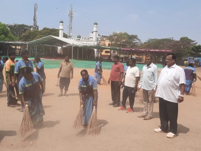 ನಾಳೆ ರಂಜಾನ್ ಹಬ್ಬದ ಹಿನ್ನೆಲೆ ನಗರದ ಚಾಮರಾಜಪೇಟೆಯಲ್ಲಿರುವ ಈದ್ಗಾ ಮೈದಾನವನ್ನು ಸ್ವಚ್ಛ ಗೊಳಿಸುತ್ತಿರುವ ಜಿಬಿಎ ಪೌರಕಾರ್ಮಿಕರು. ಬಿಬಿಎಂಪಿ ಮಾಜಿ ಸದಸ್ಯ ಚಂದ್ರಶೇಖರ್ (ಅಪೊಡೋ) ಮತ್ತು ಸ್ಥಳೀಯ ಮುಖಂಡರು ಇದ್ದಾರೆ.