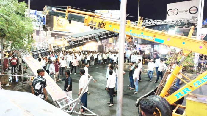 ಸರ್ದಾರ್ ವಲ್ಲಭಭಾಯಿ ಪಟೇಲ್ ವೃತ್ತದ ಕಡೆಗೆ ಜಿಲ್ಲಾಧಿಕಾರಿ ಕಚೇರಿಯಿಂದ ವಾಹನಗಳು ಬರದಂತೆ ಬ್ಯಾರಿಕೇಡ್ ಹಾಕಿ ನಿಯಂತ್ರಿಸಲಾಯಿತು. ಸ್ವಲ್ಪ ಹೊತ್ತಿನ ನಂತರ ಕ್ರೇನ್ನಿಂದ ಕಮಾನನ್ನು ಮೇಲೆತ್ತಲಾಯಿತು.