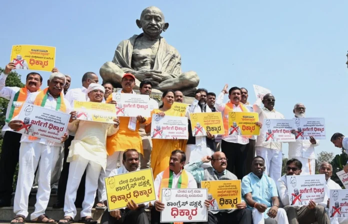 ಬಿಜೆಪಿ ರಾಜ್ಯಾಧ್ಯಕ್ಷ ಬಿ.ವೈ. ವಿಜಯೇಂದ್ರ ಅವರ ನೇತೃತ್ವದಲ್ಲಿ ನಡೆದ ಧರಣಿ ಪ್ರತಿಭಟನೆಯಲ್ಲಿ ಪ್ರತಿಪಕ್ಷಗಳ ನಾಯಕರಾದ ಆರ್. ಅಶೋಕ್, ಛಲವಾದಿ ನಾರಾಯಣ ಸ್ವಾಮಿ, ಕೇಂದ್ರ ಸಚಿವ ಶೋಭಾಕರ್ಲಂದಾಜೆ ಸೇರಿದಂತೆ ಬಿಜೆಪಿಯ ಹಲವು ಶಾಸಕರು, ಸಂಸದರು ಭಾಗಿಯಾಗಿ ಖರ್ಗೆ ಅವರ ವಿರುದ್ಧ ಧಿಕ್ಕಾರದ ಘೋಷಣೆಗಳನ್ನು ಕೂಗಿದರು.