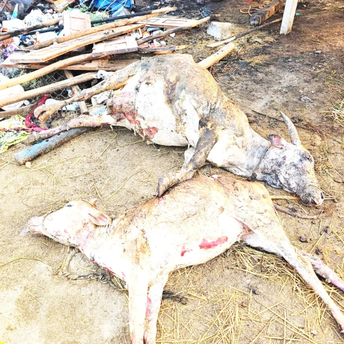 ಸೈದಾಪುರ:ಫೆ.11:ಸಮೀಪದ ಗೊಂದೆಡಗಿ ಗ್ರಾಮದ ನಾಗಪ್ಪ ಹಣಮಂತ ಯಲ್ಲಪ್ಪನೋರ್ ಅವರ ದನದ ಕೊಟ್ಟಿಗೆಗೆ ಆಕಸ್ಮಿಕವಾಗಿ ವಿದ್ಯುತ್ ಶಾರ್ಟ ಸಕ್ರ್ಯೂಟ್ನಿಂದ ಬೆಂಕಿ ತಗುಲಿ ಕೊಟ್ಟಿಗೆಯಲ್ಲಿದ್ದ ಒಂದು ಗರ್ಭಿಣಿ ಹಸು, ಎರಡು ಕರುಗಳು ಸಾವನ್ನಪ್ಪಿ, ಒಂದು ಕರುವಿಗೆ ಗಂಭೀರ ಗಾಯಗಳಾದ ದುರ್ಘಟನೆ ಶನಿವಾರ ರಾತ್ರಿ ಸಂಭವಿಸಿದೆ.
