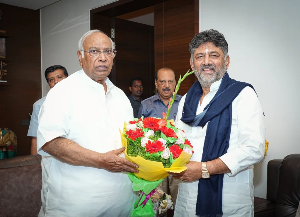 ಉಪಮುಖ್ಯಮಂತ್ರಿ ಡಿ.ಕೆ. ಶಿವಕುಮಾರ್ ಅವರು ನಿನ್ನೆ ರಾತ್ರಿ ಬೆಂಗಳೂರಿನಲ್ಲಿರುವ ಎಐಸಿಸಿ ಅಧ್ಯಕ್ಷ ಮಲ್ಲಿಕಾರ್ಜುನಖರ್ಗೆ ಅವರನ್ನು ಅವರ ಸದಾಶಿವನಗರದ ನಿವಾಸದಲ್ಲಿ ಭೇಟಿ ಮಾಡಿ ಒಂದು ಗಂಟೆಗೂ ಹೆಚ್ಚು ಕಾಲ ಚರ್ಚೆ ನಡೆಸಿದ್ದರು.