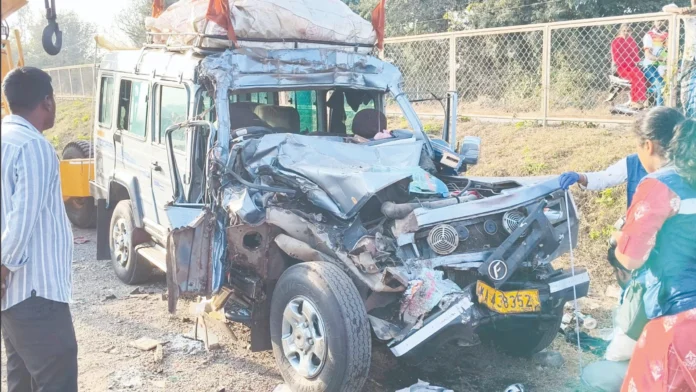 ನಿಂತಿದ್ದ ಲಾರಿಯ ಹಿಂಬದಿಗೆ ಕ್ರೂಸರ್ ವಾಹನ ಡಿಕ್ಕಿ ಹೊಡೆದ ರಭಸಕ್ಕೆ ಮುಂಭಾಗ ಸಂಪೂರ್ಣ ನಜ್ಜುಗುಜ್ಜಾಗಿದೆ.