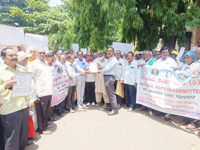 ವಿಜಯಪುರ,ಏ.16:ಇಪಿಎಸ್- 95 ರಾಷ್ಟ್ರೀಯ ಸಂಘರ್ಷ ಸಮಿತಿ ವತಿಯಿಂದ ಪಿಂಚಣಿದಾರರು ವಿವಿಧ ಬೇಡಿಕೆಗಳಿಗೆ ಆಗ್ರಹಿಸಿ ನಗರದ ಡಾ.ಅಂಬೇಡ್ಕರ್ ವೃತ್ತದಲ್ಲಿ ಒಂದು ದಿನದ ಸಾಂಕೇತಿಕ ಧರಣಿ ಸತ್ಯಾಗ್ರಹ ನಡೆಸಿ ಪ್ರತಿಭಟನಾ ಮೆರವಣಿಗೆ ಮುಖಾಂತರ ಅಪರ ಜಿಲ್ಲಾಧಿಕಾರಿ ಡಾ. ಔದ್ರಾಮ ಅವರ ಮೂಲಕ ಪ್ರಧಾನಮಂತ್ರಿ ನರೇಂದ್ರ ಮೋದಿ ಅವರಿಗೆ ಮನವಿ ಸಲ್ಲಿಸಿದರು