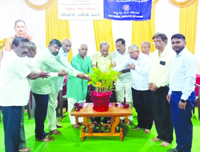 ತಾಲೂಕಿನ ಬೈಲೂರ ನಿಷ್ಕಲ ಮಂಟಪದಲ್ಲಿ ನಡೆಯುತ್ತಿರುವ ಕಿನಾವಿವ ಸಂಘ ಪದವಿ ಕಾಲೇಜಿನ ರಾಷ್ಟ್ರೀಯ ಸೇವಾ ಯೋಜನೆ ವಾರ್ಷಿಕ ವಿಶೇ?À ಶಿಬಿರವನ್ನು ಉದ್ಘಾಟಿಸಿ ಮಾತನಾಡಿ. ಇಂದಿನ ತಂತ್ರಜ್ಞಾನ ಯುಗದಲ್ಲಿ ಜನರು ಸಾಮಾಜಿಕ ಸ್ಪಂದನೆಯನ್ನು ಕಳೆದುಕೊಂಡಿದ್ದು ಕೇವಲ ಸ್ವಾರ್ಥಿ ಜೀವನವನ್ನು ನಡೆಸುತ್ತಿದ್ದಾರೆ, ಸಮಾಜದಲ್ಲಿ ಸಂಬಂಧಗಳು ಕಳಚಿದ ಕೊಂಡಿಗಳಾಗಿವೆ. ಇದರಿಂದ ನಮ್ಮ ಸಮಾಜದ ಮೇಲೆ ಸಾಕಷ್ಟು ದುಷ್ಪರಿಣಾಮ ಉಂಟಾಗಿದ್ದು ಇದನ್ನು ತಡೆಗಟ್ಟಲು ಸಾಮಾಜಿಕ ಪಿಡುಗುಗಳನ್ನು ಮುಕ್ತಗೊಳಿಸಲು ಸ್ಪಂದಿಸುವಂತೆ ಯುವಕರನ್ನು ಬೆಳೆಸಬೇಕಾಗಿದೆ. ಯುವಕರನ್ನು ರಾಷ್ಟ್ರದ ಅಭಿವೃದ್ಧಿಯಲ್ಲಿ ತೊಡಗಿಸುವುದು ನಮ್ಮೆಲ್ಲರ ಮೂಲ ಕರ್ತವ್ಯವಾಗಿದೆ ಅದಕ್ಕಾಗಿ ವಿದ್ಯಾರ್ಥಿಗಳಿಗೆ ವಿಶೇಷ ತರಬೇತಿಗಳನ್ನು ನೀಡುವುದರ ಮೂಲಕ ಅವರಲ್ಲಿ ಸಮಾಜದ ಅರಿವು ಮೂಡಿಸುವುದು ಎಲ್ಲ ವರ್ಗದ ಜನರೊಂದಿಗೆ ಸಾಮರಸ್ಯದಿಂದ ಬಾಳುವಂತೆ ಬೆಳೆಸಬೇಕಾಗಿದೆ ಎಂದರು..