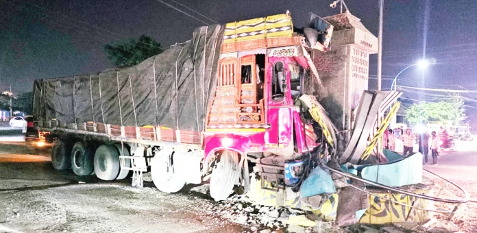 ವೇಗವಾಗಿ ಬರುತ್ತಿದ್ದ 18 ಚಕ್ರದ ಟ್ರಕ್ ಚಾಲಕನ ನಿಯಂತ್ರಣ ತಪ್ಪಿ ವೃತ್ತಕ್ಕೆ ನೇರವಾಗಿ ಡಿಕ್ಕಿ ಹೊಡೆದ ಪರಿಣಾಮ ಟ್ರಕ್ನ ಮುಂಭಾಗ ಸಂಪೂರ್ಣ ನಜ್ಜುಗುಜ್ಜಾಗಿದೆ.