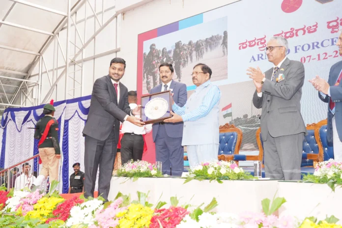 ವಿಜಯಪುರ,ಡಿ.8: 2022ನೇ ಸಾಲಿನಲ್ಲಿ ಜಿಲ್ಲೆಗೆ ನಿಗದಿಪಡಿಸಿದ ಗುರಿಗಿಂತ ಅತಿ ಹೆಚ್ಚು ಸಶಸ್ತ್ರ ಪಡೆಗಳ ಧ್ವಜ ನಿಧಿ ಸಂಗ್ರಹ ಮಾಡಿದ ಹೆಗ್ಗಳಿಕೆಗೆ ವಿಜಯಪುರ ಜಿಲ್ಲೆಯು ಪ್ರಶಸ್ತಿಗೆ ಭಾಜನವಾಗಿದ್ದು, ಸಶಸ್ತ್ರ ಪಡೆಗಳ ದ್ವಜ ದಿನಾಚರಣೆ ಅಂಗವಾಗಿ ಬೆಂಗಳೂರಿನ ರಾಜಭವನದಲ್ಲಿ ಡಿಸೆಂಬರ್ 7ರಂದು ನಡೆದ ಸಮಾರಂಭದಲ್ಲಿ ಆಹಾರ ಇಲಾಖೆಯ ಉಪ ನಿರ್ದೇಶಕರೂ ಆದ ಸೈನಿಕ ಕಲ್ಯಾಣ ಮತ್ತು ಪುನರ್ವಸತಿ ಇಲಾಖೆಯ ಉಪನಿರ್ದೇಶಕರೂ ಆದ ವಿನಯಕುಮಾರ ಪಾಟೀಲ ಅವರು ಗೃಹ ಸಚಿವರಾದ ಡಾ.ಜಿ.ಪರಮೇಶ್ವರ ಅವರಿಂದ ಪ್ರಶಸ್ತಿ ಸ್ವೀಕರಿಸಿದರು.